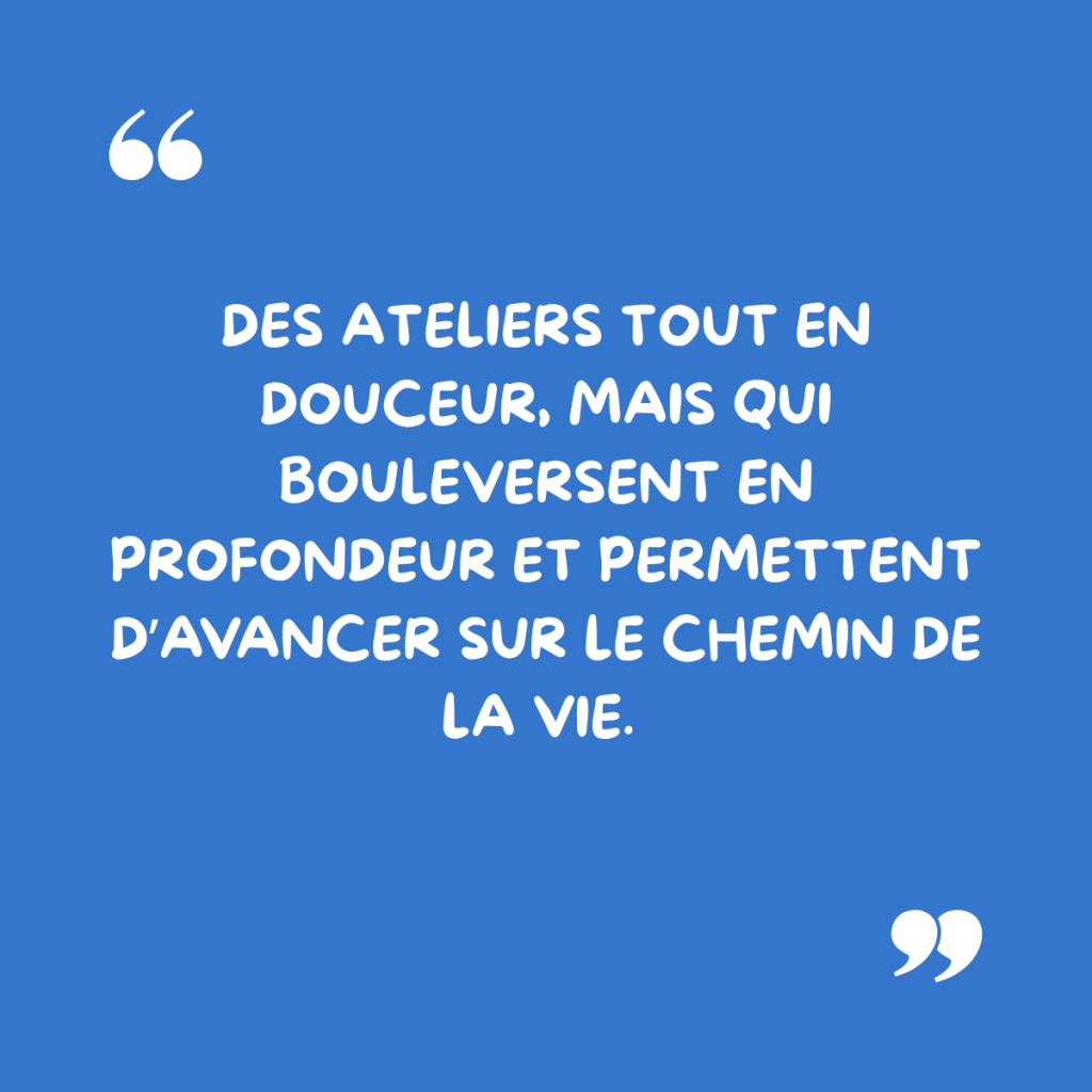 J’apprends à exprimer de façon créative mes sensations, mes émotions, mes sentiments. Les mettre à l’extérieur de moi, par la voie du dessin, du découpage et de l’écriture, me permet de mieux identifier qui agit en moi, selon les circonstances. Quelles sont mes forces, quels sont mes freins ? Et alors, je peux faire des choix justes pour moi.